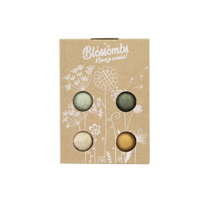 This beautiful box contains 4 flower bombs. The Blossombs Giftbox is a nice gift for Mother's Day. And in the spring you throw the Blossomb in the garden, in a pot on the balcony, a vacant piece of land, a bare verge or along the ditch. Give a sustainable gift during the holidays and you and the bees can enjoy beautiful, wild flowers in the spring.