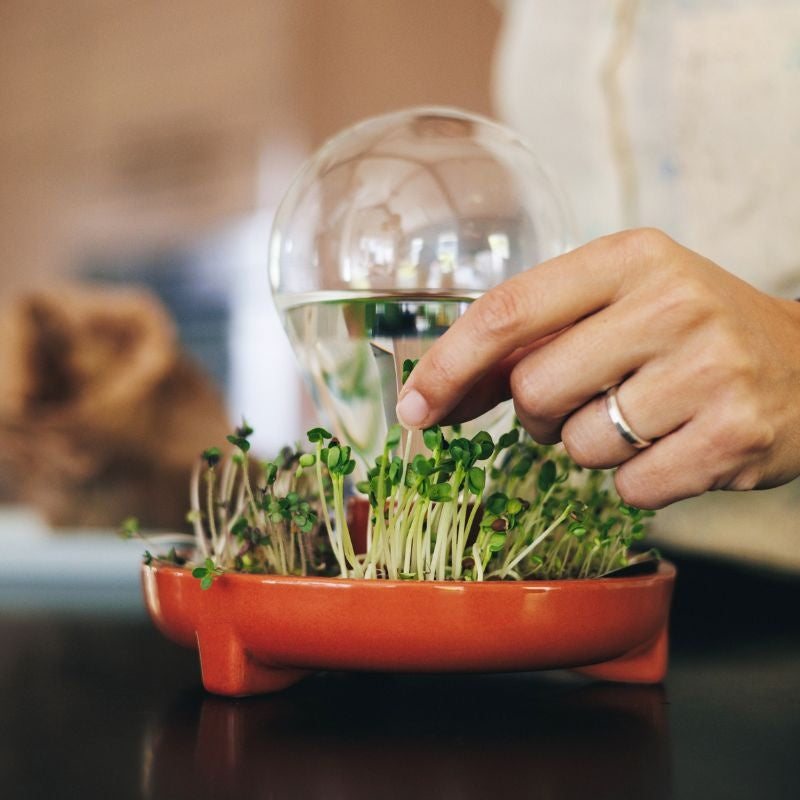 The patella crescenda (latin for growing dish) is a fun way to grow healthy microgreens in your own home all year round. The beautiful design, with a terracotta dish and glass reservoir, makes this set an asset to your kitchen.