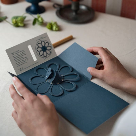 With the Magic Flower by Jurianne Matter you can send a sweet message or wish to the recipient. Write your text on one of the two enclosed circles (one extra in case you make a mistake) and place it in the heart of the flower. Then fold the Magic Flower closed according to the instructions in the packaging and send the card in the accompanying envelope.