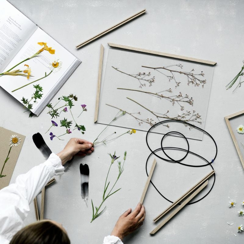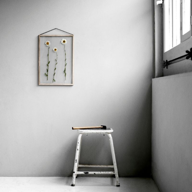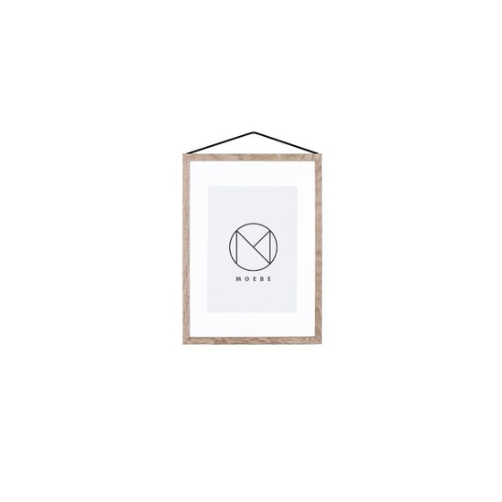 FRAME is a picture frame, consisting of two pieces of acrylic glass, four edges made of untreated oak and a rubber band. The rubber band holds the frame together and serves to hang the frame on your wall. Frame your favorite poster or photo and leave space. The background forms the passe partout through both plexiglass parts.
