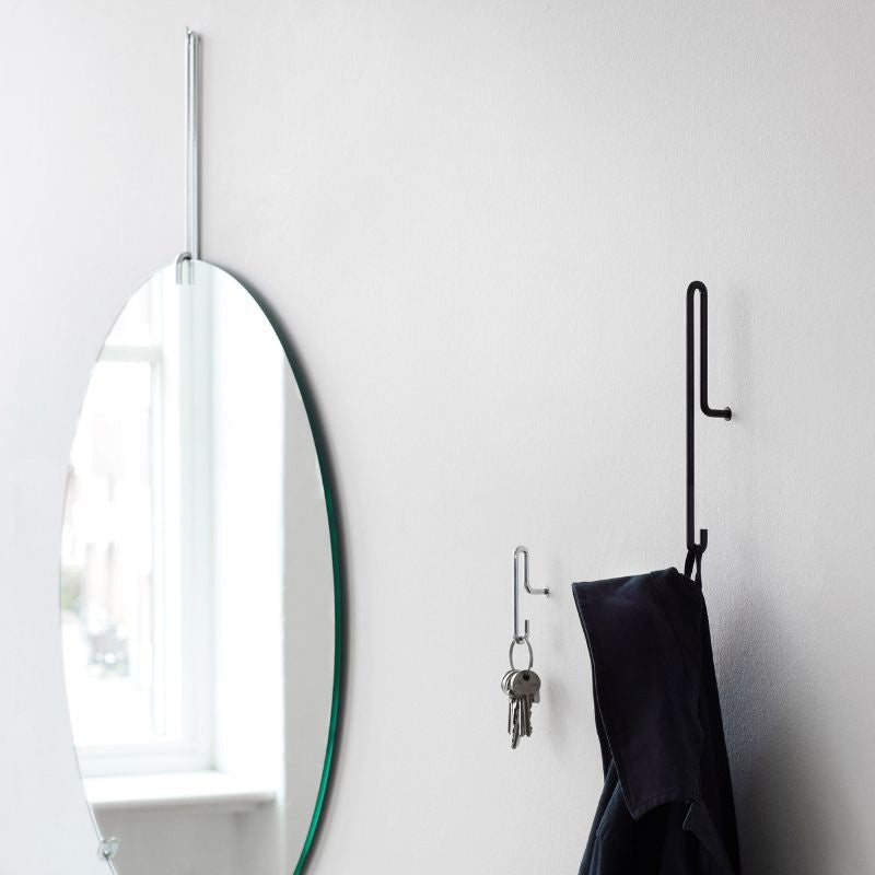 The wall hooks by MOEBE are a design that consists of only one continuous line. This simple but special wall hook has two hanging points. Use the larger top for your coat or a large scarf and the small hook at the bottom for tea towels, accessories or your keys.