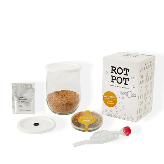 Fermentation is an ancient cooking technique in which yeasts and bacteria convert naturally occurring sugars into mild acids. The RotPot Mustard is a complete fermentation kit that you can use at home. Everything you need is included in the box; just add the fresh ingredients. Thanks to the clear step-by-step instructions, fermenting your own food becomes easy and enjoyable.