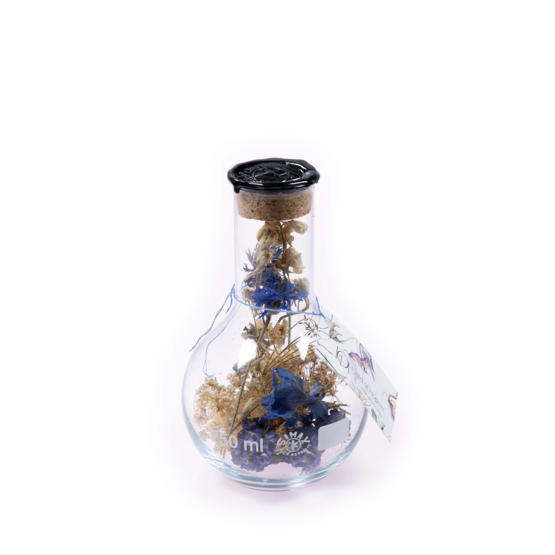 De Sperare 250 van Field of Hope is een unieke creatie van droogbloemen, grassen en onkruid in een laboratorium fles. Een mooie combinatie van bloemen in een bolle fles. De fles is gesloten met een zwart waxzegel met logo. De fles Sperare 250 is erg leuk om cadeau te doen of om te stylen in je eigen interieur.