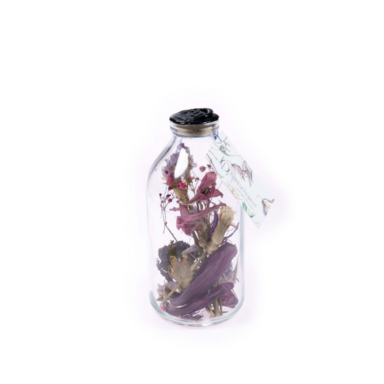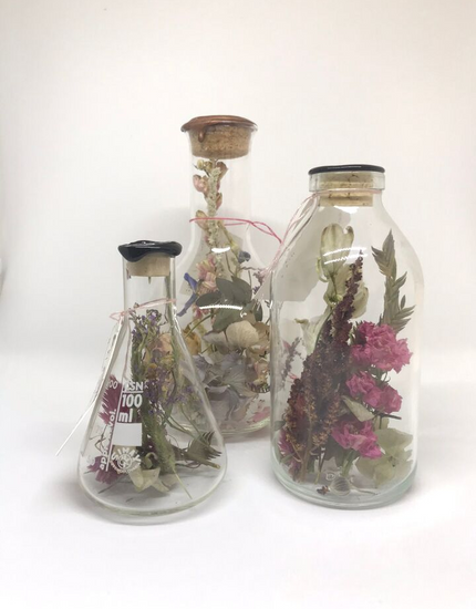 De sets droogbloemen van Field of Hope worden met met zorg en oog voor de natuur verzameld. De creaties worden met de hand samengesteld en verwerkt in vintage laboratorium flessen.