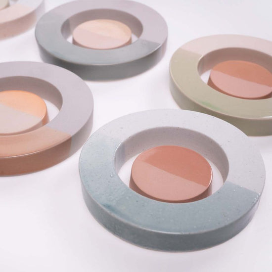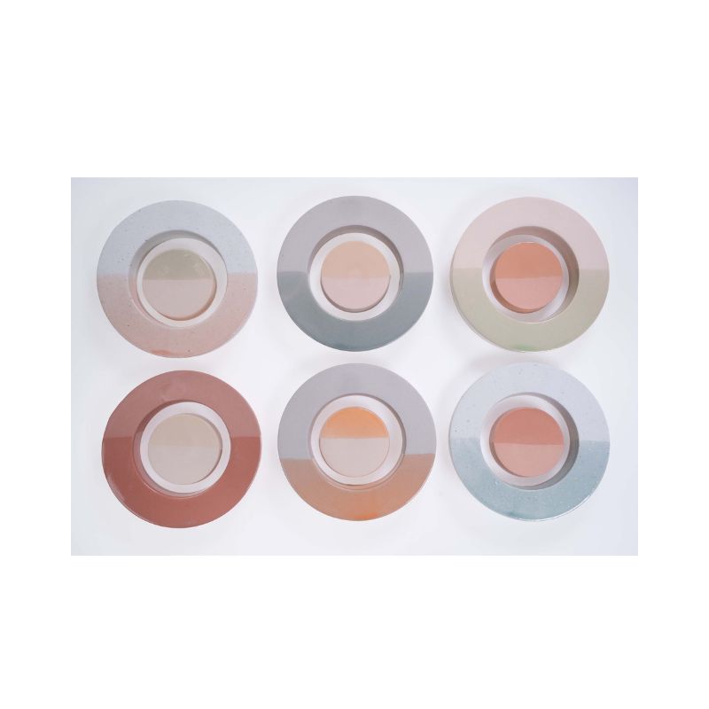 Emma is een speelse set van ronde objecten. Geïnspireerd op de kleurstalen die jaren in Hella haar atelier hingen. Emma bestaat uit een ring en een cirkel beide in 2 kleuren. Elk setje is uniek qua kleur en samenstelling, want alle kleuren worden met de hand gemengd en krijgen een deels een gekleurde glazuurlaag. Het andere deel blijft mat.