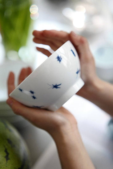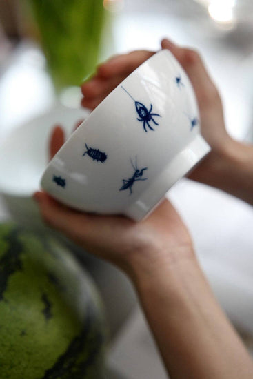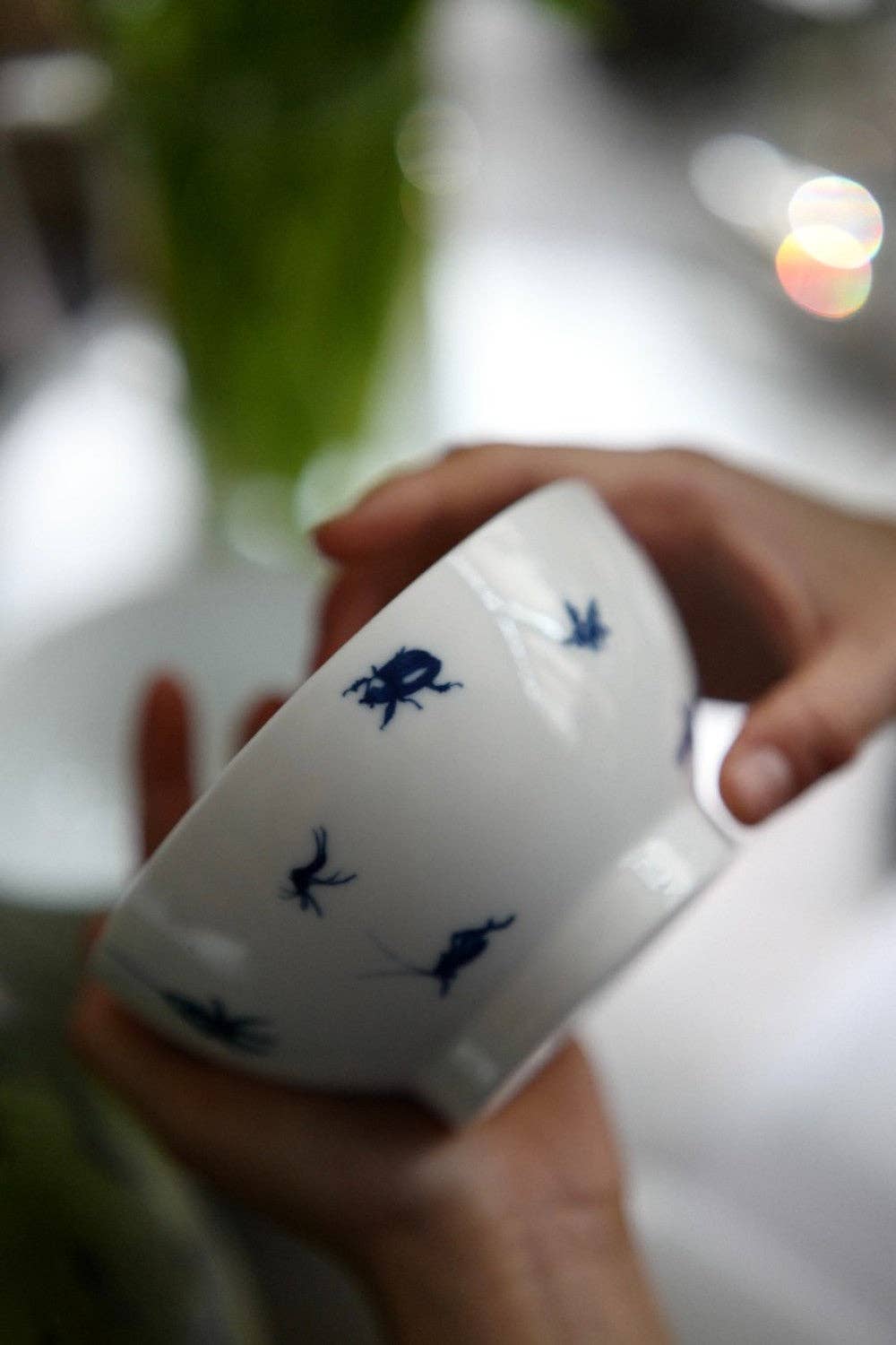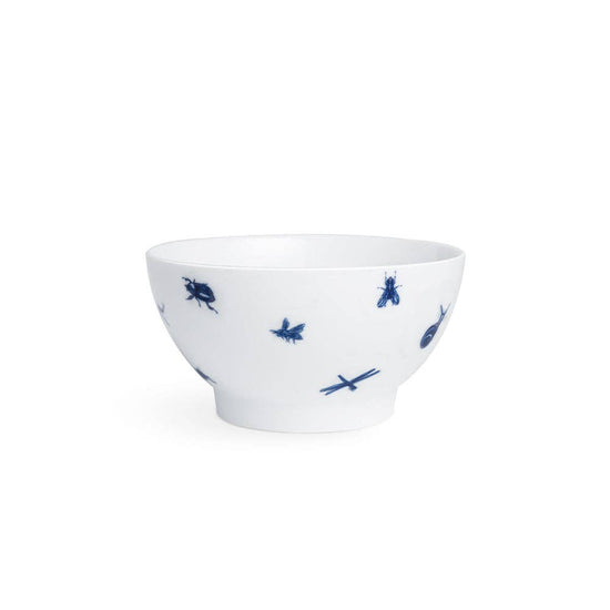 Het prachtige elegante witte porselein van Dehua, gecombineerd met de traditionele kobaltblauwe all-over insectenillustratie brengt een vleugje levendigheid en vreugde aan je dagelijkse eettafel.