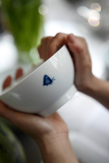 Het prachtige elegante witte porselein van Dehua, gecombineerd met de traditionele kobaltblauwe vlinder illustratie brengt een vleugje levendigheid en vreugde aan je dagelijkse eettafel.