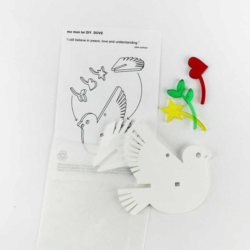 De duif is een internationaal symbool en de personificatie van vrede. Een witte duif zou vrede brengen en staat symbool voor vertrouwen, vriendschap en liefde. De mo man tai DIY dove bestaat uit een aantal losse delen, die je eenvoudig in elkaar kunt zetten. Kies voor een hartje, olijftakje of sterretje en geeft het een mooi plaatsje.