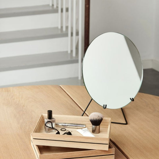 Deze unieke staande spiegel wordt op subtiele wijze vastgehouden door een lichtgewicht metalen draad, wat het ontwerp zowel functioneel als visueel aantrekkelijk maakt. De combinatie van twee contrasterende elementen – solide en doorlatend, licht en zwaar – geeft deze spiegel zijn kenmerkende karakter. Dit is minimalisme in zijn puurste vorm, waar eenvoud en elegantie samenkomen.