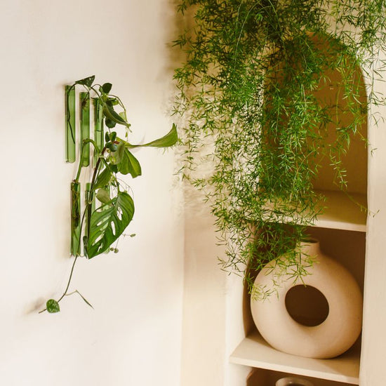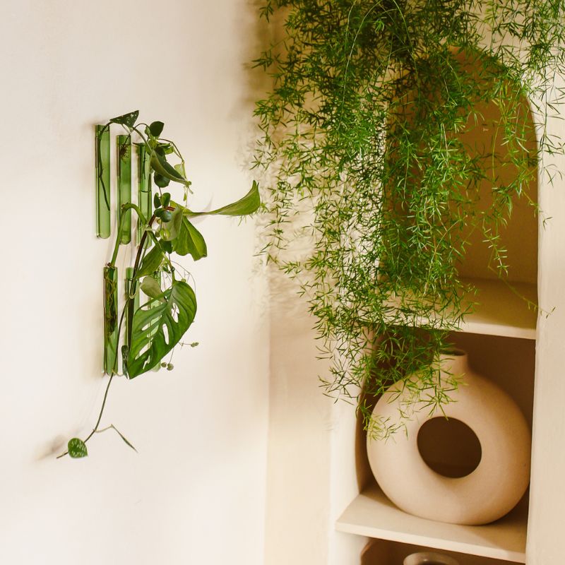 Een Muurbloempje kun je bevestigen op muurverf (op waterbasis), hout, keramiek, glas en metaal. Gebruik ze solo voor een minimalistische look, of combineer meerdere van deze wandvaasjes voor een speels groen effect aan je muur.