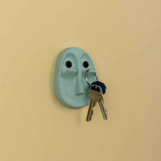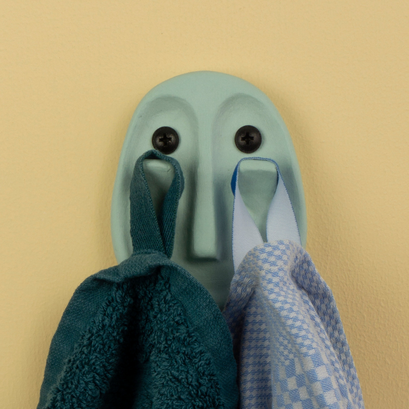 Nosy Sage van Studio Daphne Zuilhof is een handgemaakte porseleinen wandhaak. Niet alleen mooi om te zien, maar ook nog eens handig om je spullen aan op te hangen. Nosy laat zijn gezicht graag zien in de keuken, de badkamer of in de gang. Solo al een mooie blikvanger maar helemaal leuk met een paar familieleden. De zwarte oogjes zijn de meegeleverde montage schroeven.